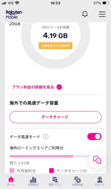 海外で使った分は画面下部の「海外ローミングエリアご利用分」